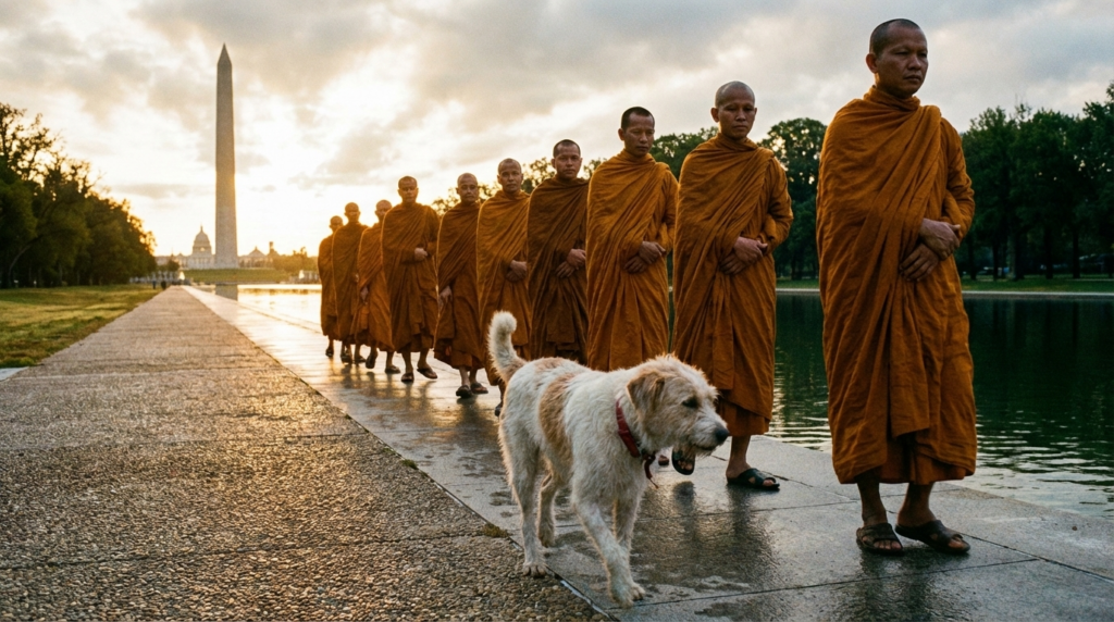 There is a specific kind of silence that descends when twenty saffron-robed men walk single-file down a six-lane American highway. It is not the silence of emptiness, but of sheer, unyielding presence. It disrupts the hum of combustion engines and the frantic pace of the morning commute. But on Tuesday, when the Walk for Peace finally crossed the Chain Bridge into Washington, D.C., the eyes of the crowd weren’t just on the monks. They were fixed on a white-and-tan dog trotting at the lead, wearing a dusty red collar and an expression of serious professional intent.